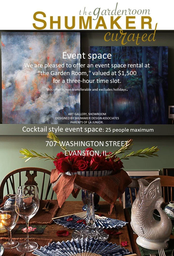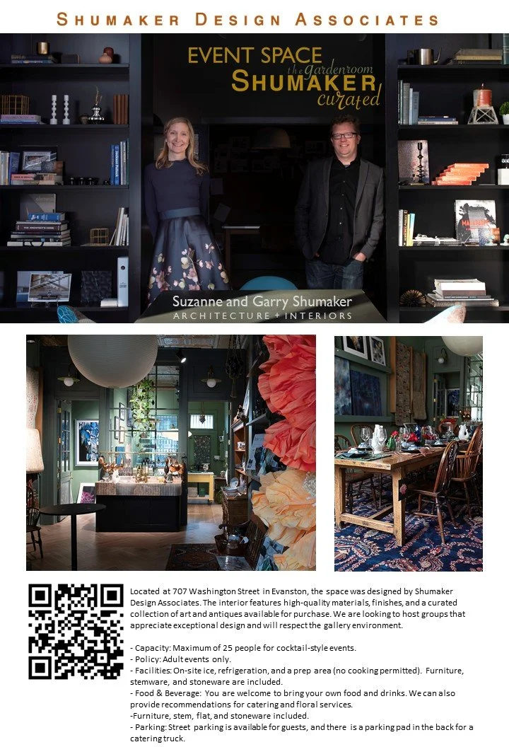 Located at 707 Washington Street in Evanston, the space was designed by Shumaker Design Associates. The interior features high-quality materials, finishes, and a curated collection of art and antiques available for purchase. We are looking to host groups that appreciate exceptional design and will respect the gallery environment.
